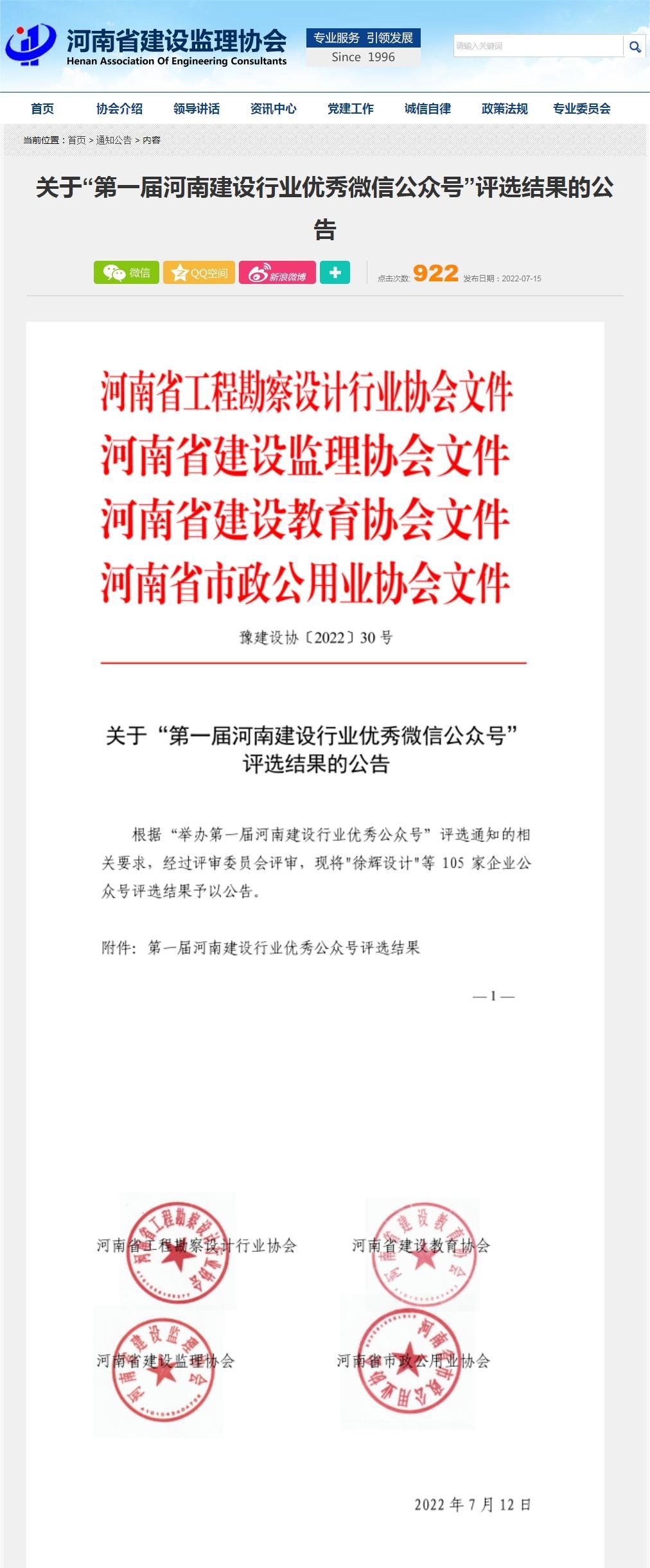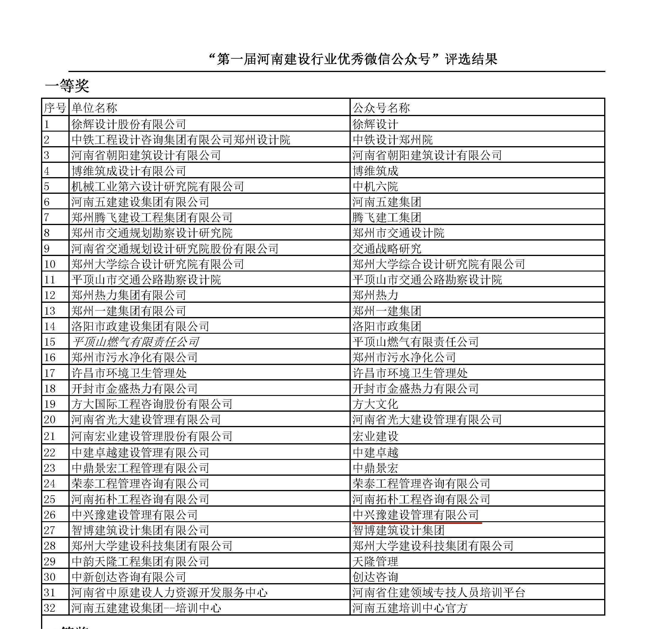 近日,由河南省工程勘察設計行業(yè)協(xié)會(huì )、河南省建設監理協(xié)會(huì )、河南省建設教育協(xié)會(huì )、河南省市政公用業(yè)協(xié)會(huì )聯(lián)合舉辦的“第一屆河南建設行業(yè)優(yōu)秀微信公眾號”評選工作落下帷幕,經(jīng)評審委員會(huì )評審,中興豫建設管理有限公司榮獲一等獎。