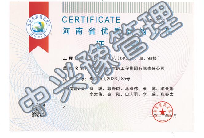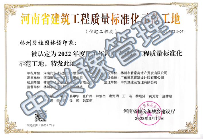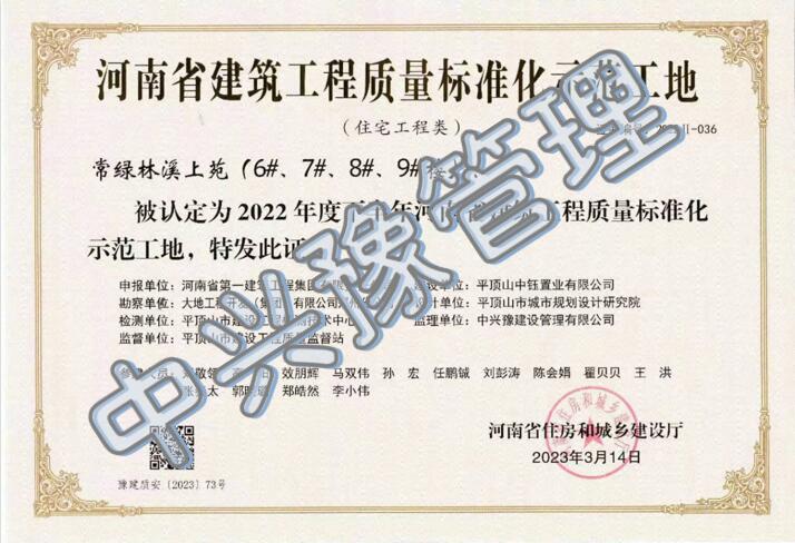 近日,我公司監理的常綠林溪上苑6#樓、7#樓、8#樓、9#樓)項目榮獲“2022年度下半年河南省建筑工程質(zhì)量標準化示范工地“河南省優(yōu)質(zhì)結構工程”榮譽(yù)稱(chēng)號;林州碧桂園林語(yǔ)印象項目榮獲“2022年度下半年河南省建筑工程質(zhì)量標準化示范工地”榮譽(yù)稱(chēng)號;濱河西路快速化工程(三標段)項目榮獲“2022年度下半年河南省建筑工程質(zhì)量標準化示范工地”榮譽(yù)稱(chēng)號。