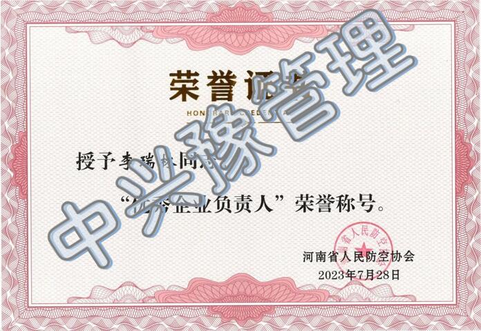 近日,河南省人民防空協(xié)會(huì )公布了關(guān)于優(yōu)秀會(huì )員單位及個(gè)人結果的公告。經(jīng)單位申請、專(zhuān)家評估、社會(huì )公示等程序,我公司榮獲優(yōu)秀會(huì )員單位榮譽(yù)稱(chēng)號,總裁李瑞林榮獲優(yōu)秀企業(yè)負責人榮譽(yù)稱(chēng)號。