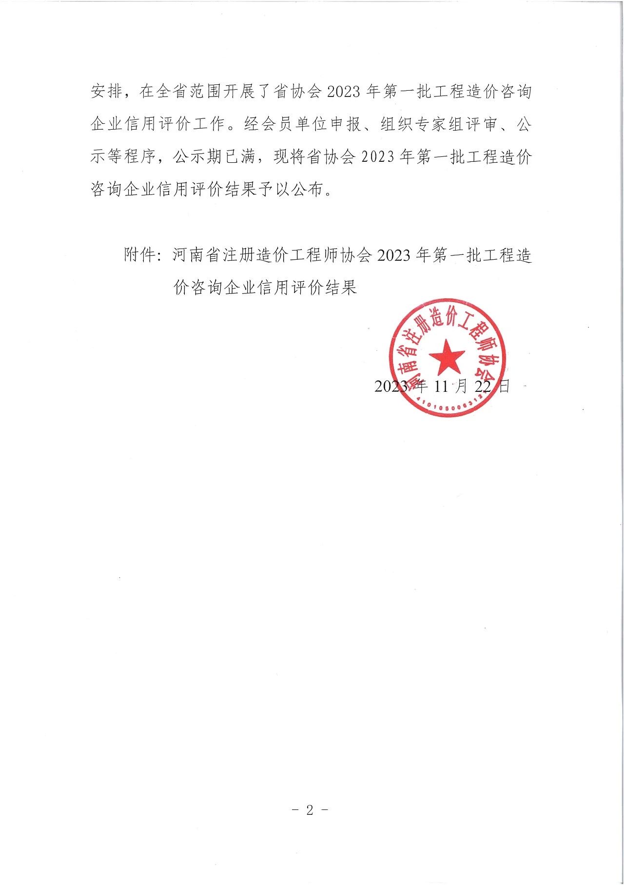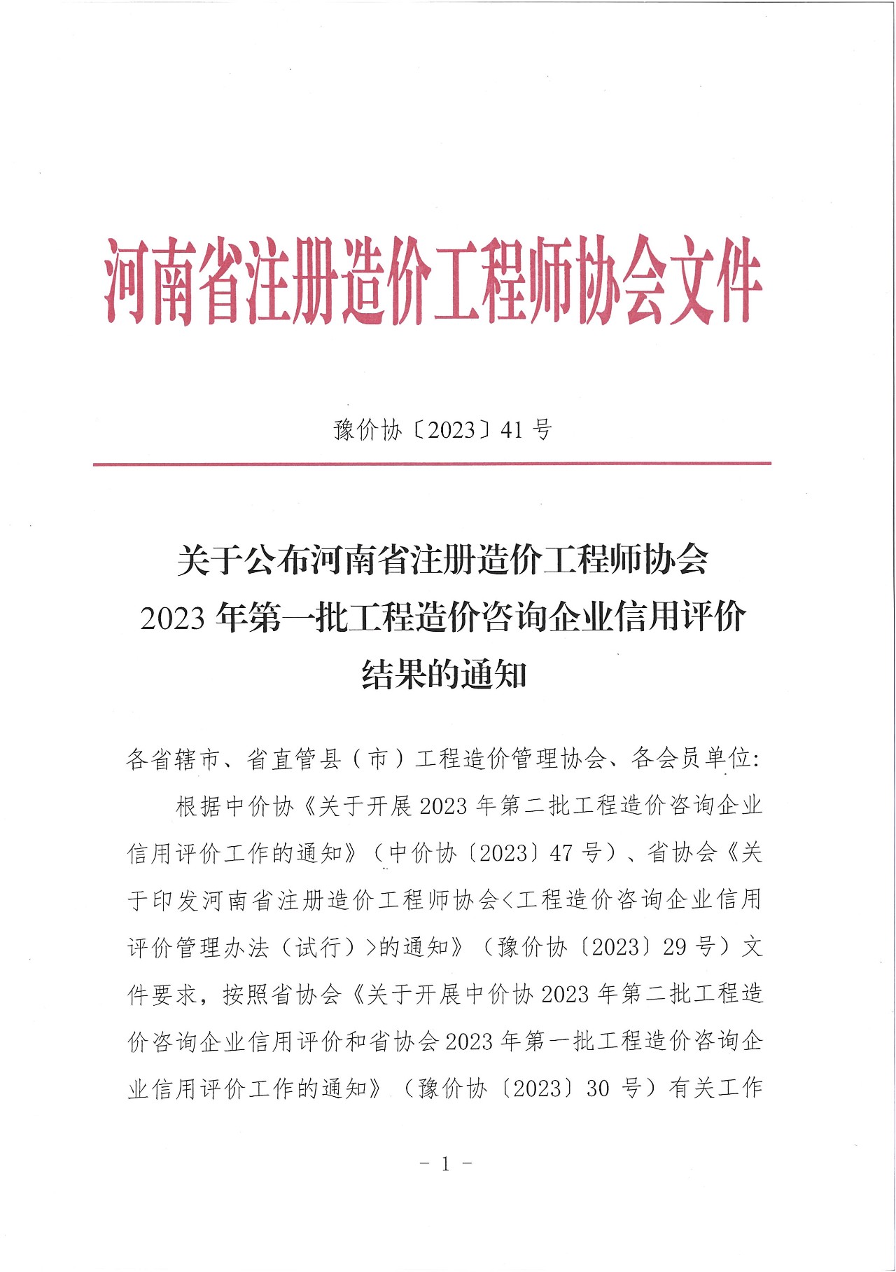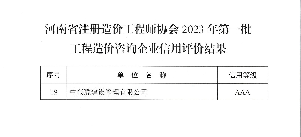 近日,河南省注冊造價(jià)工程師協(xié)會(huì )公布了《2023年第一批工程造價(jià)咨詢(xún)企業(yè)信用評價(jià)結果的通知》,經(jīng)單位申報、專(zhuān)家組評審、公示等程序,中興豫建設管理有限公司榮獲2023年工程造價(jià)咨詢(xún)企業(yè)信用等級AAA級企業(yè)!