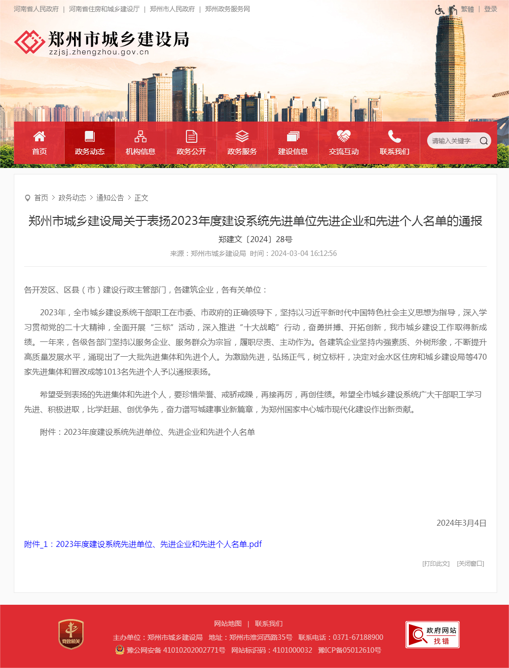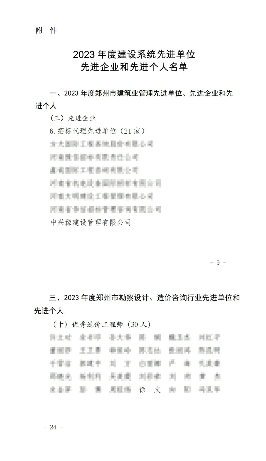 近日,鄭州市城鄉建設局公布了《關(guān)于表?yè)P2023年度建設系統先進(jìn)單位先進(jìn)企業(yè)和先進(jìn)個(gè)人名單的通報》,中興豫建設管理有限公司榮獲2023年度建設系統招標代理行業(yè)先進(jìn)單位,造價(jià)師徐文榮獲優(yōu)秀造價(jià)工程師榮譽(yù)稱(chēng)號!