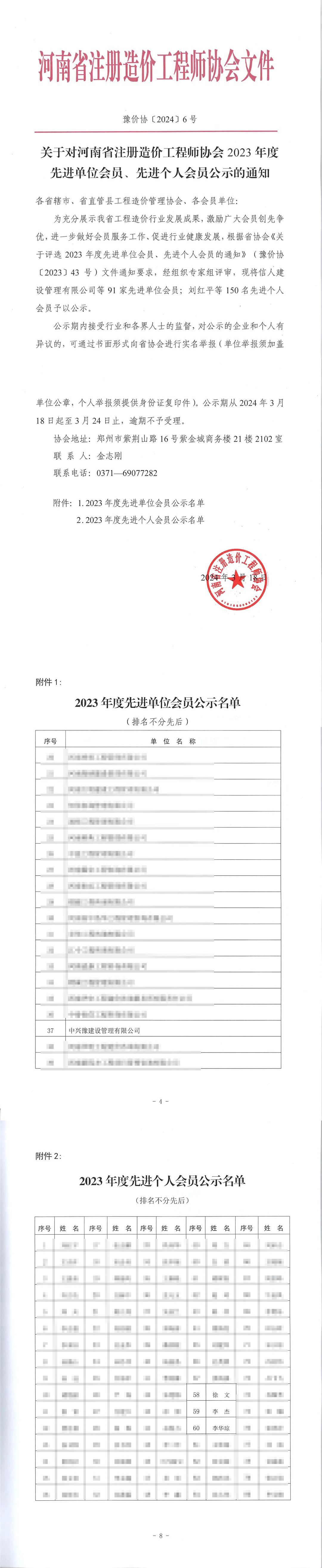 喜報 | 中興豫建設管理有限公司榮獲河南省注冊造價(jià)工程師協(xié)會(huì )2023年度先進(jìn)單位會(huì )員、先進(jìn)個(gè)人會(huì )員榮譽(yù)稱(chēng)號