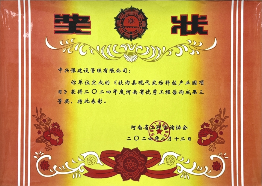 近日河南省工程咨詢(xún)協(xié)會(huì )公布了《2024年度全省優(yōu)秀工程咨詢(xún)成果獎獲獎項目的通知》。經(jīng)會(huì )員單位申報、專(zhuān)家小組認真評審等程序,我公司申報的“扶溝縣現代家紡科技產(chǎn)業(yè)園項目”榮獲三等獎