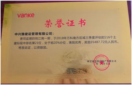 本項目在萬(wàn)科房地產(chǎn)有限公司于2018年組織的南方區域三季度評估的116個(gè)土建標段中位列第21位,處于前20%分位,表現優(yōu)秀,獲得優(yōu)秀標段“榮譽(yù)證書(shū)”,并獲獎金 35487.72元。