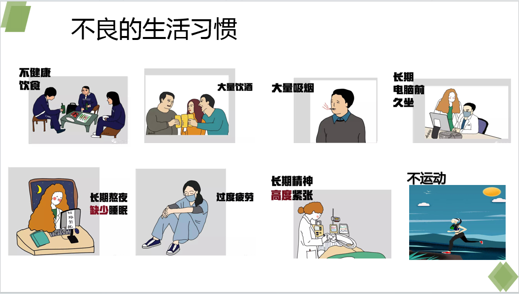 由于現今社會(huì )工作壓力大,生活節奏快等原因,人們在生活中存在以下不良生活習慣:不健康飲食、大量飲酒、大量吸煙、長(cháng)期電腦前久坐、長(cháng)期熬夜缺少睡眠、過(guò)度疲勞、長(cháng)期精神高度緊張、缺乏運動(dòng)等。這些不良生活習慣會(huì )導致人們的身體長(cháng)期處于“亞健康”狀態(tài),從而誘發(fā)一些慢性疾病?,F今“三高”等慢性疾病呈年輕化趨勢,與這些不良生活習慣脫不了干系。