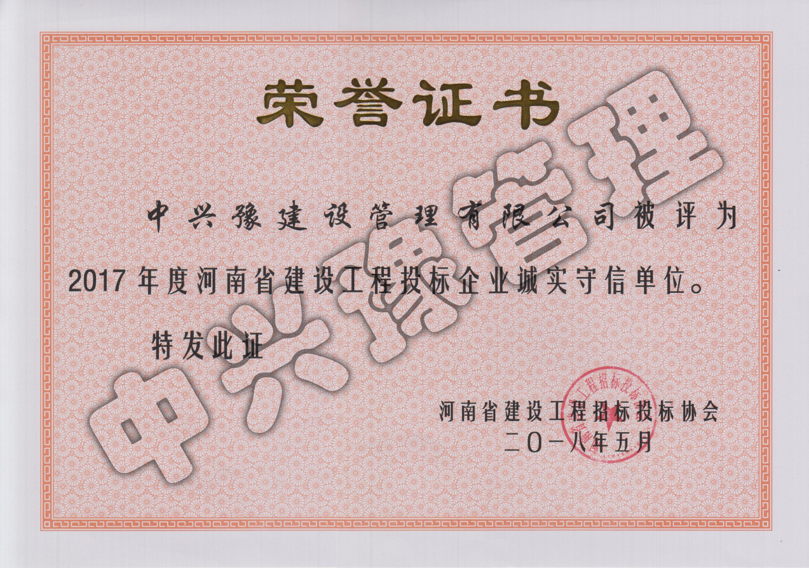 2017年度河南省建設工程投標企業(yè)誠實(shí)守信單位-公司榮譽(yù)